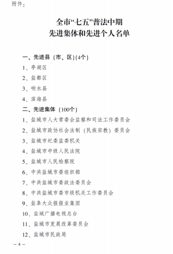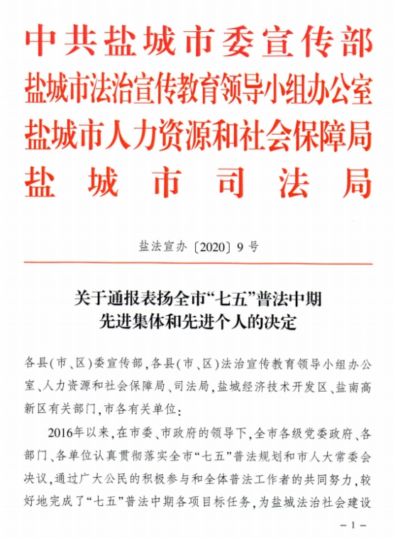 近日,盐城市委宣传部、盐城市法治宣传教育领导小组办公室、盐城市人力资源和社会保障局、盐城市司法局联合发文《关于通报表扬全市“七五”普法中期先进集体和先进个人的决定》(盐法宣办〔2020〕9号),我校获盐城市‘七五’普法中期先进集体”荣誉称号。
