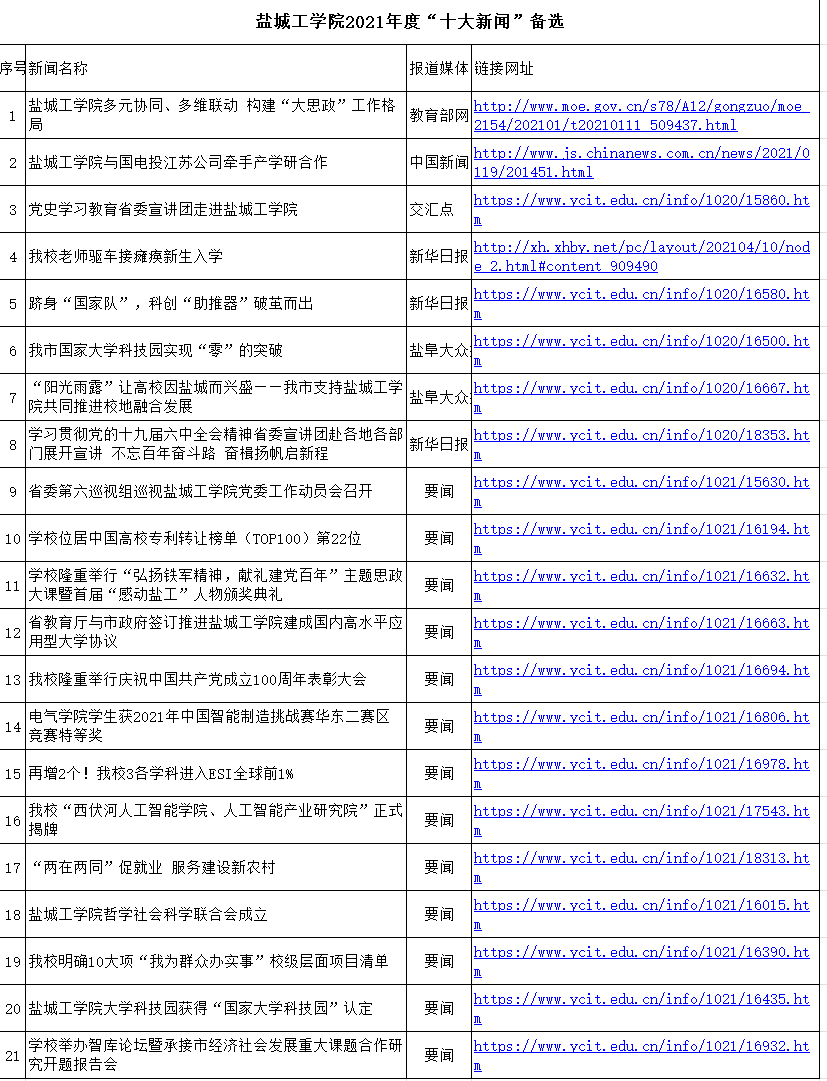 评选围绕庆祝中国共产党成立100周年,年度重点工作,着眼于新闻事件纵向对学校的建设和发展具有开拓性进步,横向对学校事业全局的重要性、示范性、推动性等标准,选出新闻21项。宣传部将通过网络投票或专家评议等方式,最终确定盐城工学院2021年度“十大新闻”。