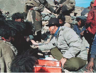 每次下乡前孔繁森都用自己的钱购置药品装满小药箱,工作结束后,他的身边总是围着一群等候看病的群众。