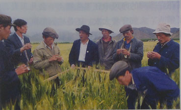 在拉萨工作期间,孔繁森高度重视科学技术推广。这是他和科研人员在田间研究科学种田。
