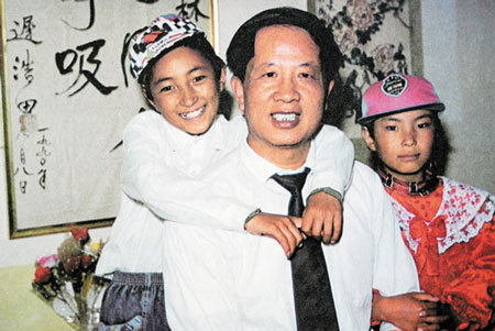 孔繁森在拉萨期间收养了三个孤儿。这是曲印和贡桑幸福地依偎在他身边。