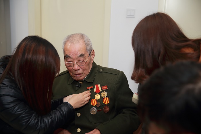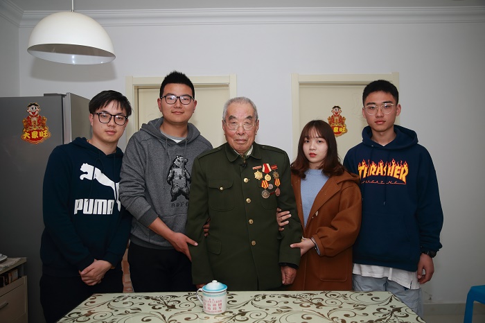 宋老年过九十,却身体硬朗,口齿清楚,对待来访的同学十分热情。他先是带领同学们翻阅了老照片,并一一讲述照片中的故事,他指着照片中的人,满眼笑意地说:“这是几年前你们来看我的照片,真好啊。”随后,他指着军装上的一枚枚军章,向同学们细细讲述当年的战争情况。讲到动情处,宋老几次哽咽,红了眼眶,他握着同学们的手说:“孩子们,以前的年代,真苦啊!我没想到自己能活到今天。你们一定要珍惜这来之不易的幸福生活,好好学习文化知识,报效祖国!”同学们围坐在宋老身边,听他讲述那段令人惊心动魄的战争岁月和谆谆教诲,深受感染。大家纷纷表示,今年是建国70周年,作为当代大学生,一定不能忘记过去,要忠于祖国、忠于人民,更要志存高远,肩负起中华民族伟大复兴的重任,为祖国建设添砖加瓦。